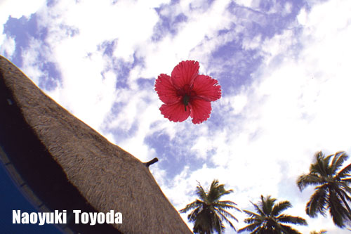 空飛ぶハイビスカス。プールの水面に花を浮かべ、水中からトリッキーに撮ってみた。