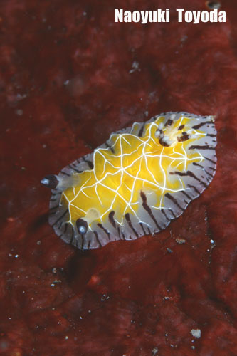 Halgerda sp.全長1.5cmほど。背中のくもの巣のような模様はなんのためのものなのか? ウミウシにはまだまだたくさんの不思議が潜んでいる。 カメラCANON EOS-D60、レンズCANON EF100mm、ハウジングJUNON EOS-D30・D60 TOYO-DA DIGITAL SPECIALEDITION、ストロボ イノンストロボZ220 2灯、ホワイトバランス プリセットストロボ光、ISO設定200、絞りF16 、シャッタースピード1/125秒、東京都八丈島 水深14m | |