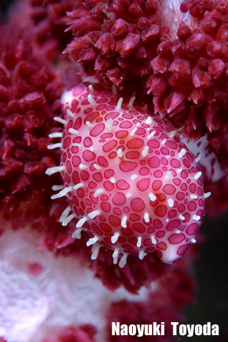 テンロクケボリガイ。大きさ1cmほど。トゲトサカ(ソフトコーラル)の中に見事にカムフラージュ。この生き物の鮮やかな模様が浮きぼりになった。 カメラCANON EOS-D60、レンズCANON EF100mm、ハウジングJUNON EOS-D30・D60 TOYO-DA DIGITAL SPECIALEDITION、ストロボ イノンストロボZ220 2灯、ホワイトバランス プリセットストロボ光、ISO設定200、絞りF16 、シャッタースピード1/125秒、神奈川県逗子 水深18m | |