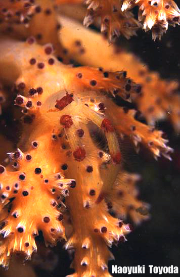 棲みかであるニクイロクダヤギに見事にカムフラージュして棲む。体長2cmほど。エビのようにも見えるが、ヤドカリの仲間である。