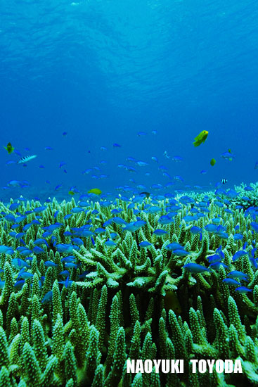 サンゴに群れるデバスズメ。海の青、デバスズメの魚体の青、違う青が織り成すショートドラマ。これまたボーッと見ていられる世界だ。