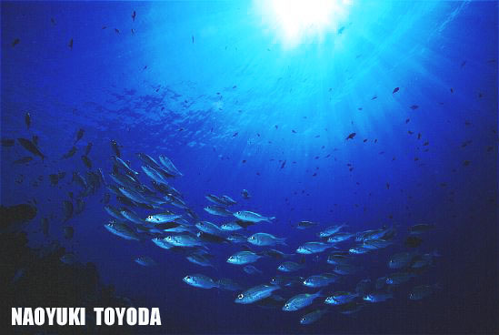 全長13cmほどのノコギリダイの群れが円弧を描くような形に変化した。青く抜けた海には、どんなサカナでも映えてしまうから不思議だ。