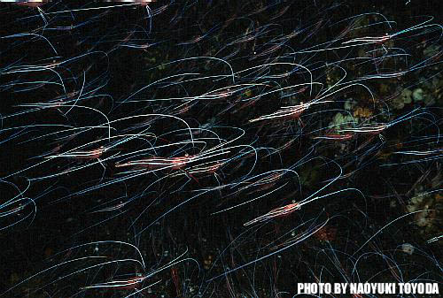 全長4〜5cm。深場で群れて泳ぐ習性がある。なかなか見ることのできないエビ。レジャーダイビングの限界を超えた深度まで潜ってしまった。
